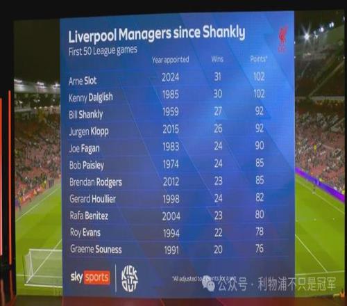 圖片顯示,在利物浦隊史自香克利至今,盡管最近7輪輸了6場,但斯洛特至今為止的前50場聯(lián)賽戰(zhàn)績,依然與達格利什并列隊史第一(102分),而勝場獨居第一(31場)。