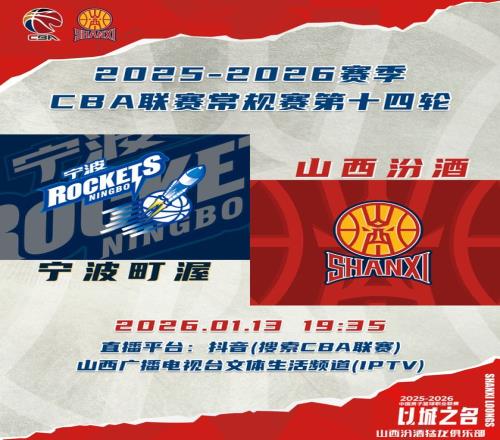 北京時間2026年1月13日19:35,2025-2026賽季CBA聯(lián)賽常規(guī)賽第14輪繼續(xù)進行,山西汾酒客場挑戰(zhàn)寧波町渥,球迷觀眾可以通過抖音(搜索CBA聯(lián)賽)、山西廣播電視臺文體生活頻道(IPTV)觀看比賽實況,在屏幕前與我們一起為山西汾酒男籃加油助威!