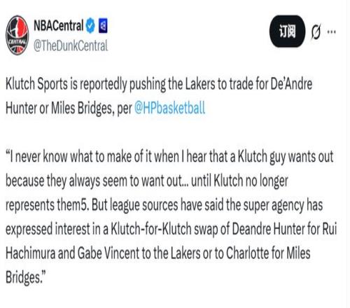 Hardwood Paroxysm寫道:“每次聽(tīng)到Klutch旗下的球員想要離隊(duì),我都不知道該作何感想——他們似乎總?cè)氯轮摺芍钡終lutch不再代理他們的合約,這種聲音就消失了。不過(guò)據(jù)聯(lián)盟消息源透露,這家頂級(jí)經(jīng)紀(jì)公司已表達(dá)了交易意向,希望促成一筆‘Klutch內(nèi)部球員互換’:要么將德安德烈-亨特送至湖人,換取八村塁和加布-文森特;要么用同樣的籌碼,向夏洛特黃蜂隊(duì)交易邁爾斯-布里奇斯。”